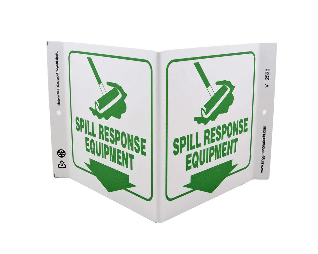 Projecting V Sign, "Spill Response Equipment," clearly communicates critical safety information. The two-sided projecting design significantly increases visibility, and is ideal for designating important workplace locations. The sign is made in the USA from 70% post-consumer recycled plastic, and measures 7"H x 12"W x 5" projecting. Two mounting holes and adhesive tabs are included for easy installation. Recycled materials support sustainability initiatives and LEED credits.