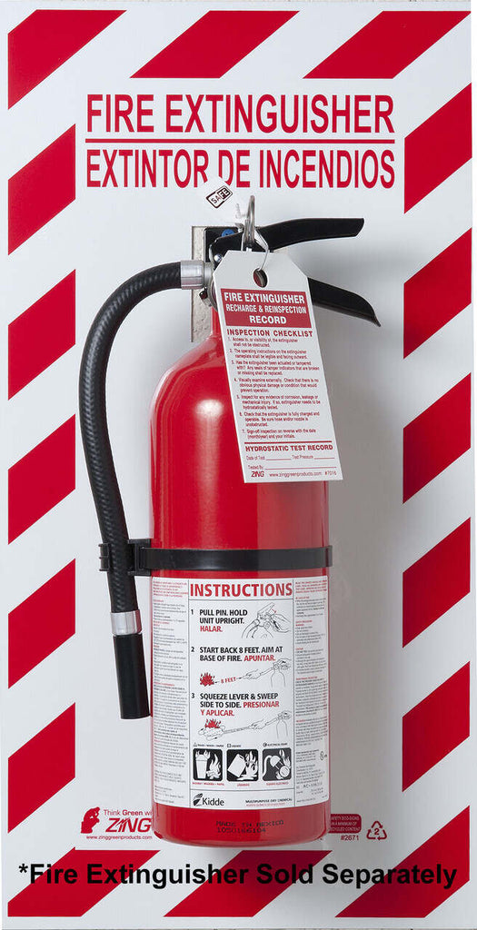 The back plate measures 24"H x 12.5"W and fits any standard wall-mounting fire extinguisher. The back plate comes with four pre-drilled mounting holes, and includes adhesive mounting tabs. The legend, "FIRE EXTINGUISHER, " is provided in English and Spanish. (Fire Extinguisher Not Included).