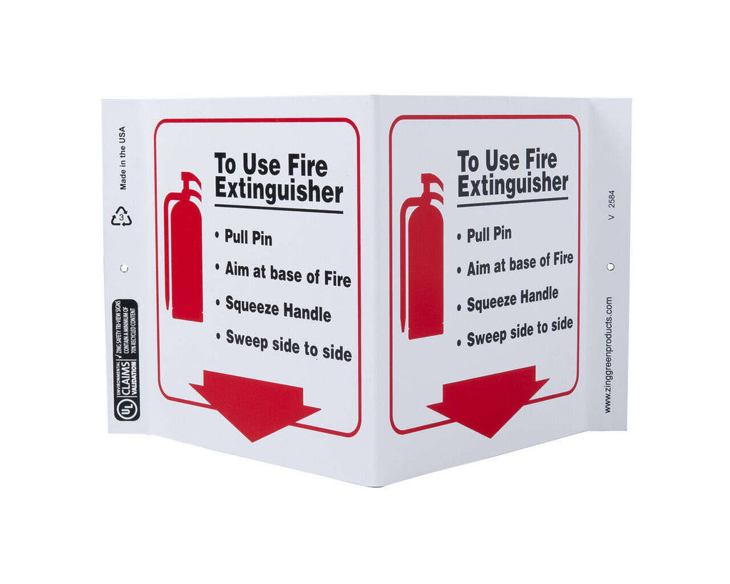 Projecting V Sign, "Fire Extinguisher, with Instructions," designates fire extinguisher locations and provides step-by-step operating instructions. The sign is made in the USA from recycled plastic, and measures 7"H x 12"W x 5" projecting. The sign features pre-drilled mounting holes, and comes with adhesive tabs for easy installation. Recycled materials support sustainability initiatives and LEED credits.