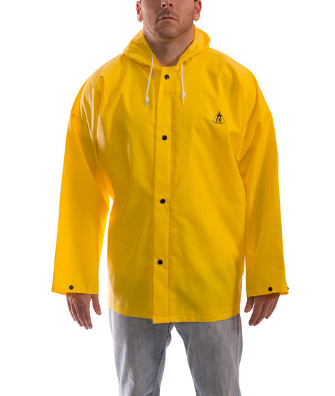 Double coated PVC on polyester jacket with hood offers durability at an economical price. Extremely high tear strength is the result of an open weave polyester scrim fabric being sandwiched between two layers of flame-resistant PVC coating.